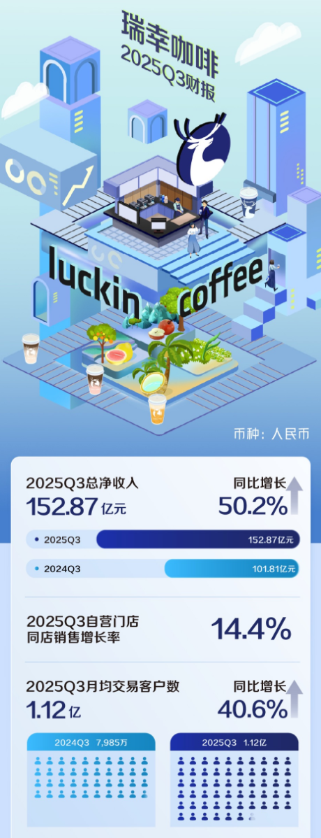 在客户方面,瑞幸咖啡三季度新增交易客户超4,200万,月均交易客户数同比增长40.6%达1.12亿,以上两个指标均创历史新高。